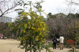 縮景園の「ミモザ}がこのころの暖かさで一気に見ごろとなりまし